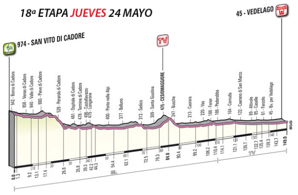 Május 24. – 18. szakasz: San Vito di Cadore – Vedelago, 149 km Várható befutó: 17:04-17:22