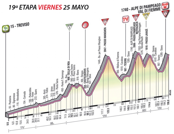 Május 25. – 19. szakasz: Treviso – Alpe di Pampeago, 198 km (hegyi befutó) Várható befutó: 16:41 / 17:23